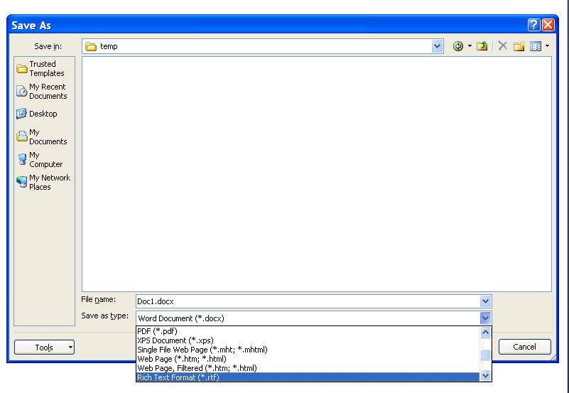 Launch Word, create a document and try to save it, using the File Save menu, or the age-old familiar short cut, Control-S. What do you get? See the following screen shot for the familiar File Save dialog. Although Microsoft formats like DOCX, DOC and XPS are available, as well as export formats like PDF, HTML and Plain Text, you will not find ODF listed.