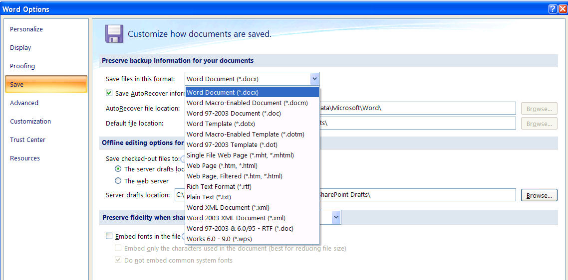Here we see how Microsoft treats the file formats it favors with first-class support. Word 2007 allows you to choose which file format will be the default format when you save a document. You can keep the default format (Draft Office Open XML) or choose the legacy binary DOC format, HTML, or older formats like RTF or even Plain Text. But you will not find the ISO OpenDocument Format on this list.